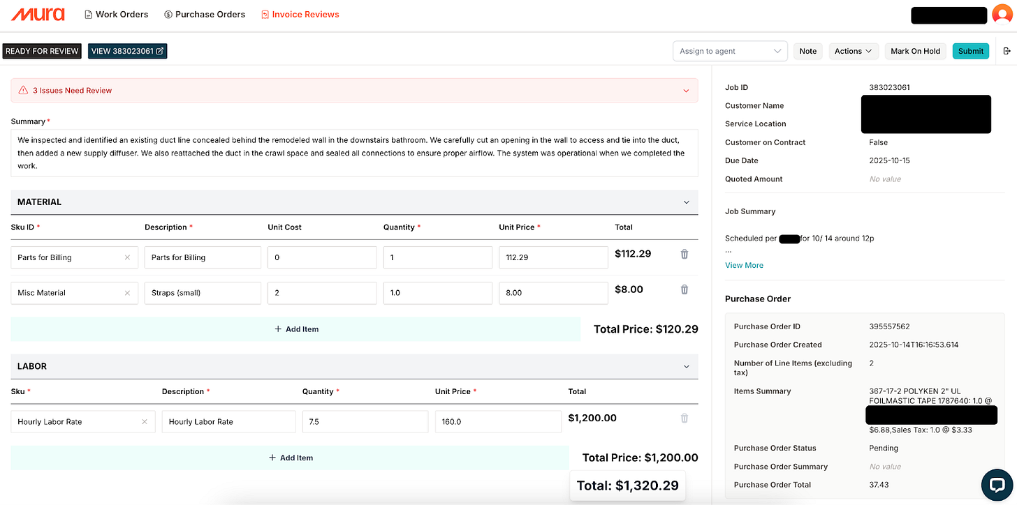 Mura is a seed-stage startup helping commercial HVAC providers get paid faster, without hiring more back-office staff. We turn messy, real-world inputs (emails, PDFs, photos, work orders) into structured data with AI and orchestration, then present suggestions with a clear, streamlined UX for our user to approve. In short: let AI do the work; let humans approve.