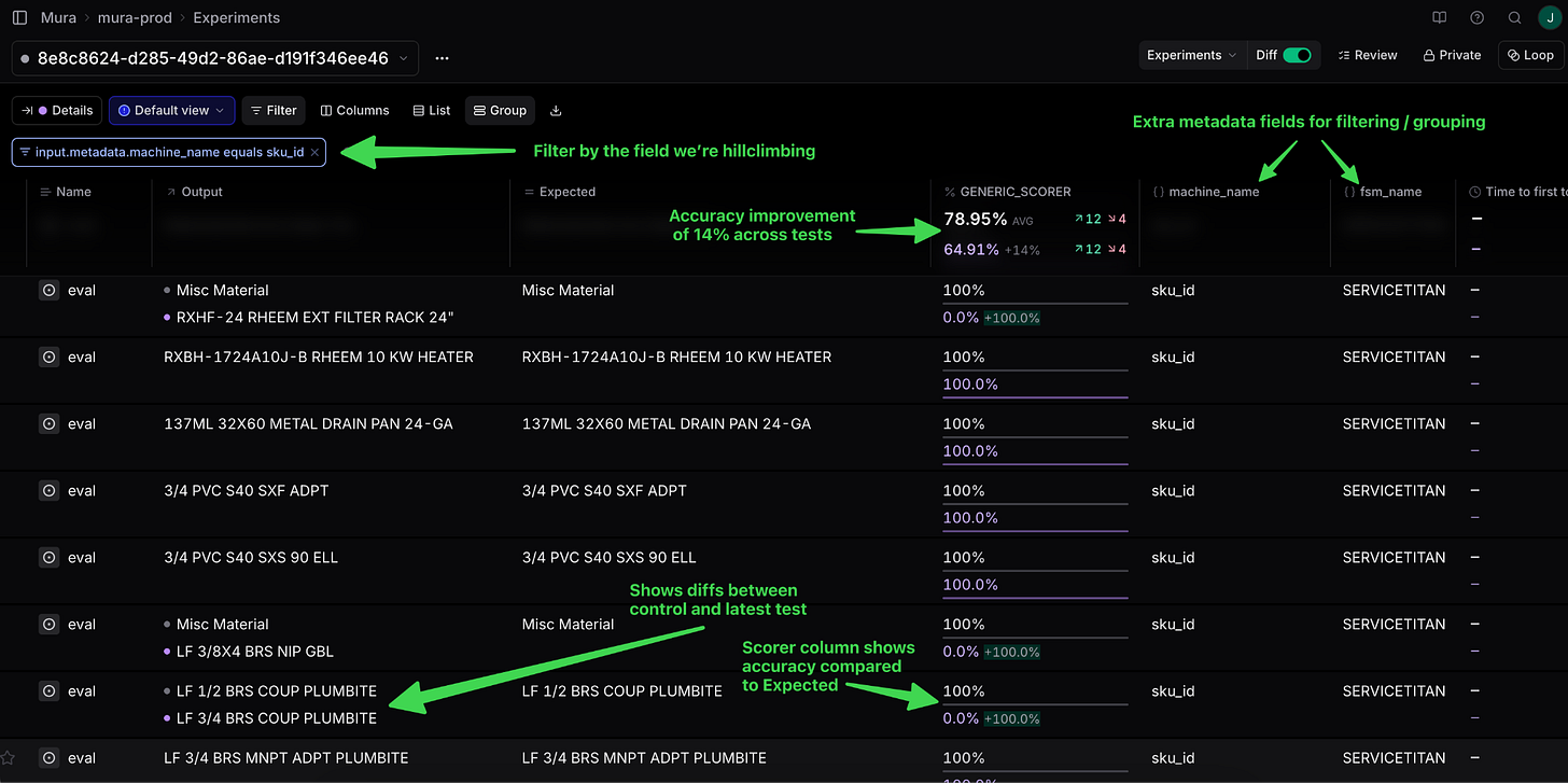 The architecture works well because we own the Mura-specific parts (how we spin up our app, what “expected” means) while Braintrust handles the visualization and comparison heavy lifting.